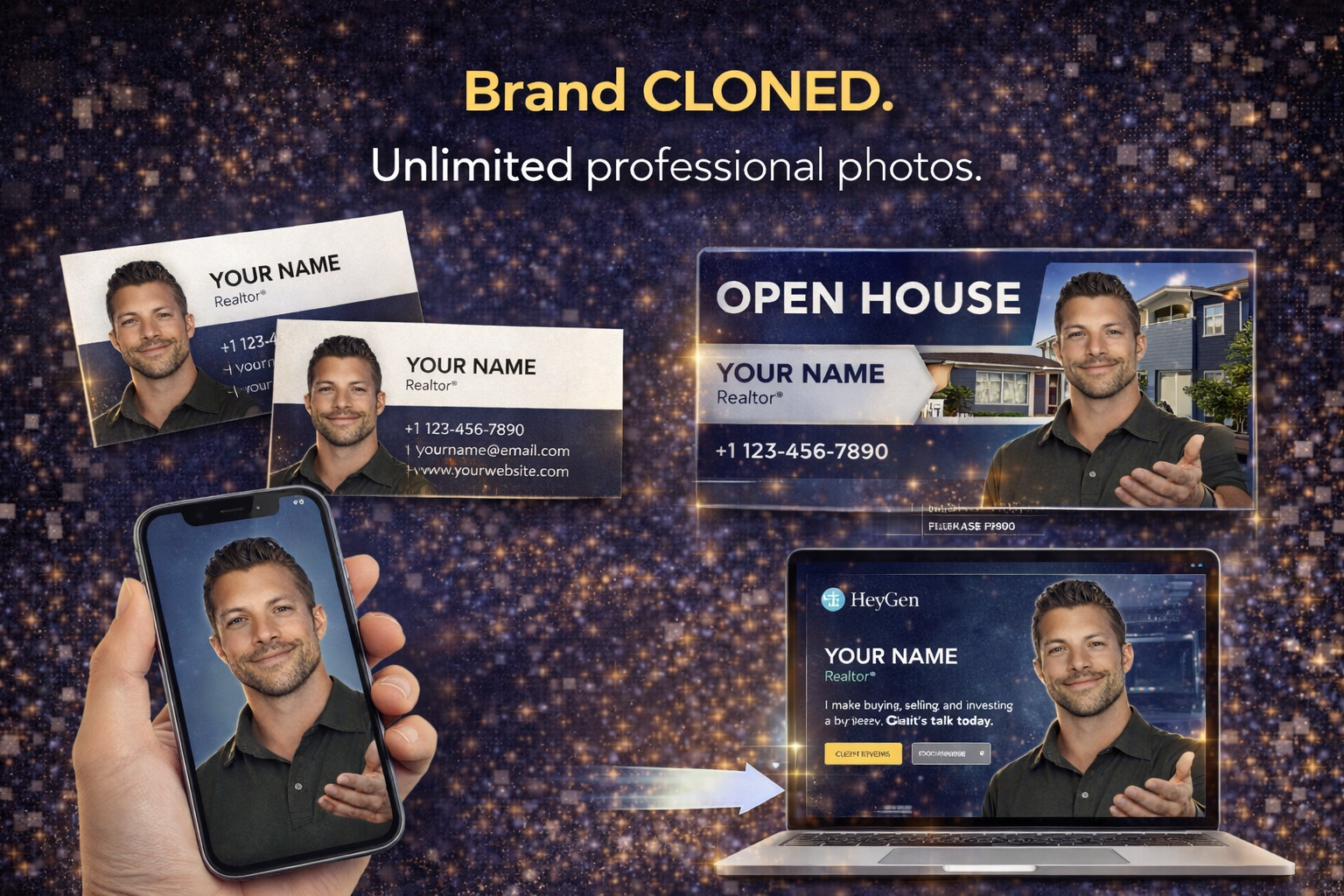 Upload 20–30 photos once. Generate unlimited professional images on-demand — headshots, in front of listings, seasonal campaigns, thumbnails — any setting, in 5 minutes.